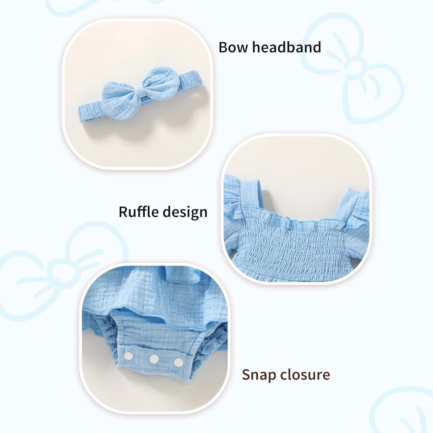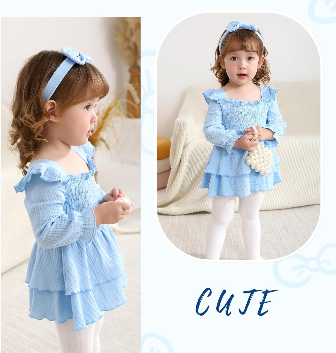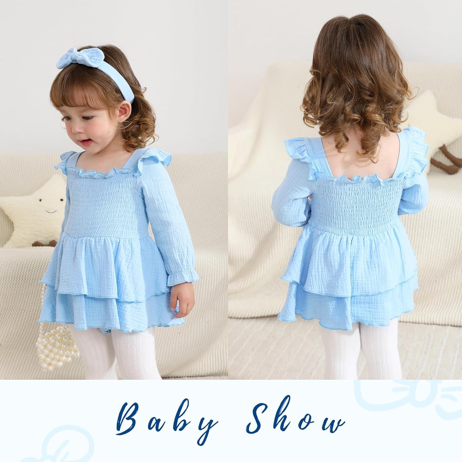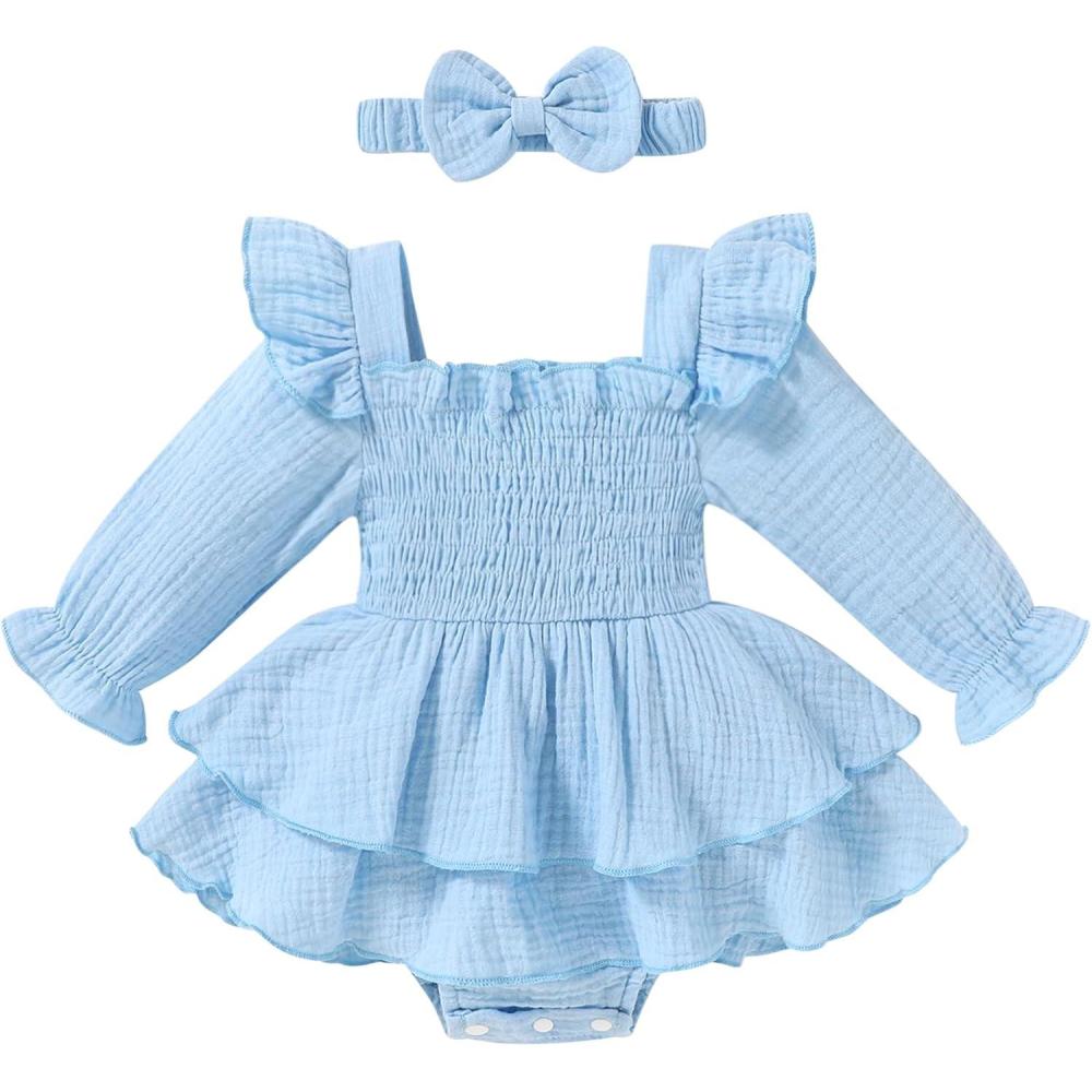 YOUNGER TREE Baby Girl Fall Clothes Infant Long Sleeve Ruffle Romper Dress with Headband Cute Toddler Winter Outfits(Blue)