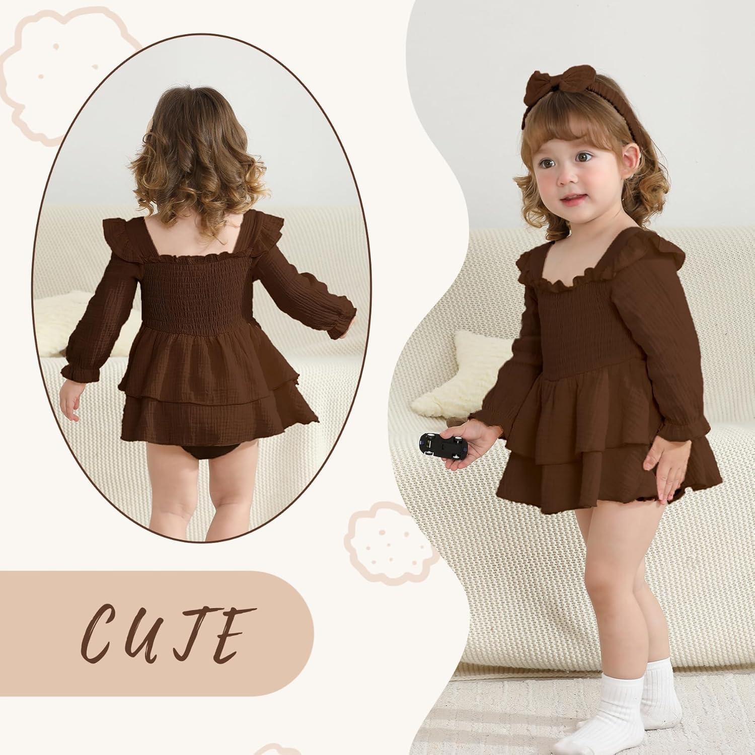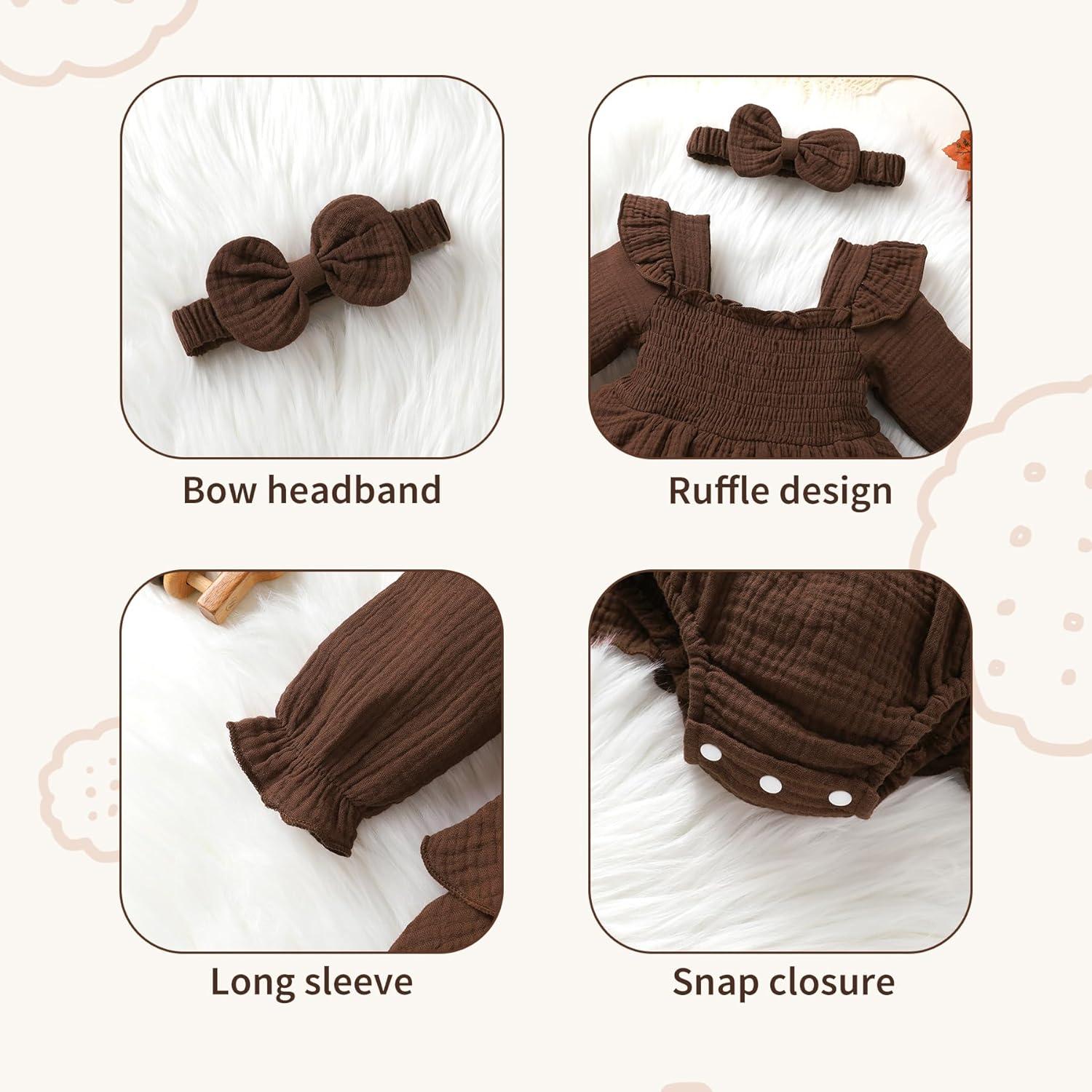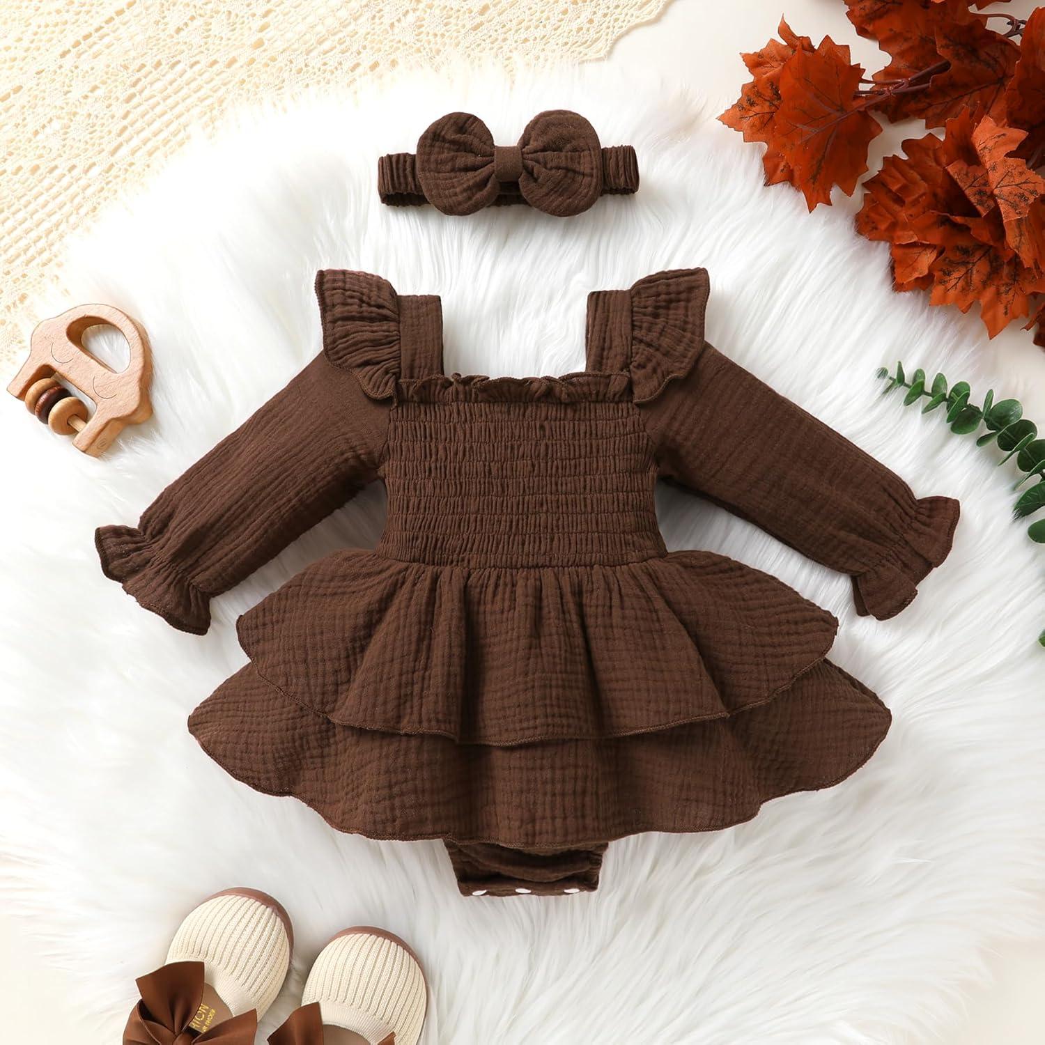 YOUNGER TREE Baby Girl Fall Clothes Infant Long Sleeve Ruffle Romper Dress with Headband Cute Toddler Winter Outfits(Brown)
