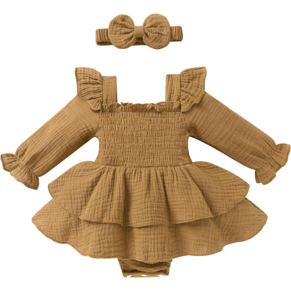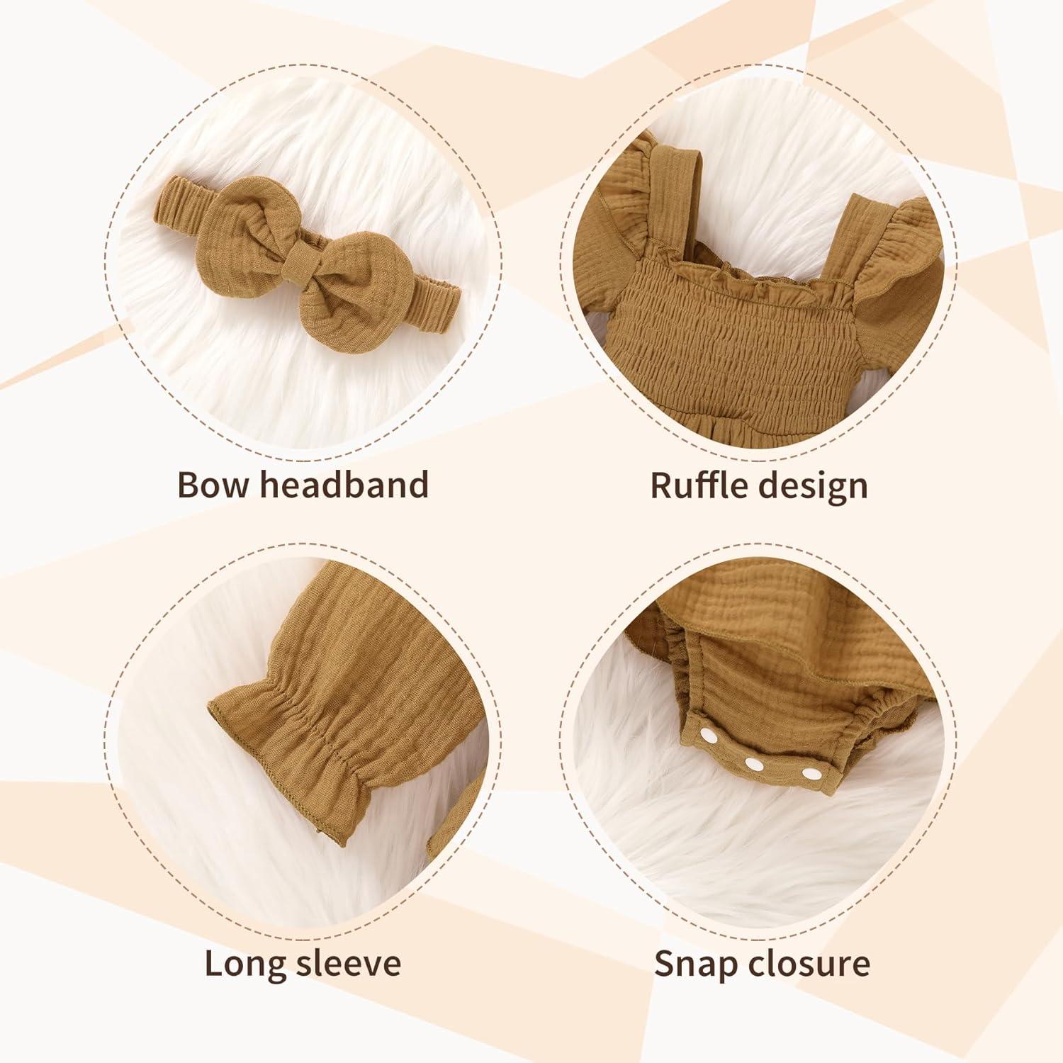 YOUNGER TREE Baby Girl Fall Clothes Infant Long Sleeve Ruffle Romper Dress with Headband Cute Toddler Winter Outfits(Yellow Brown)