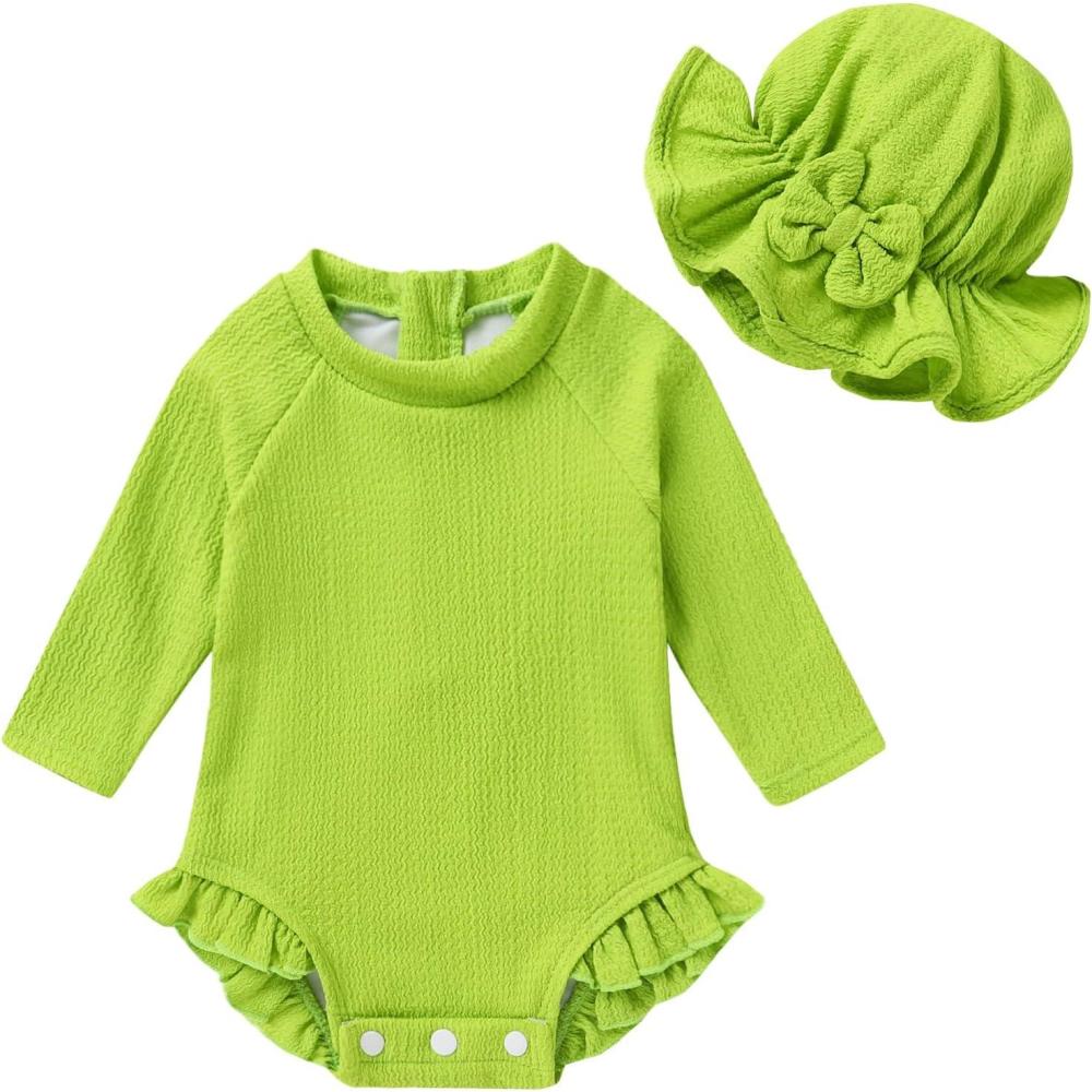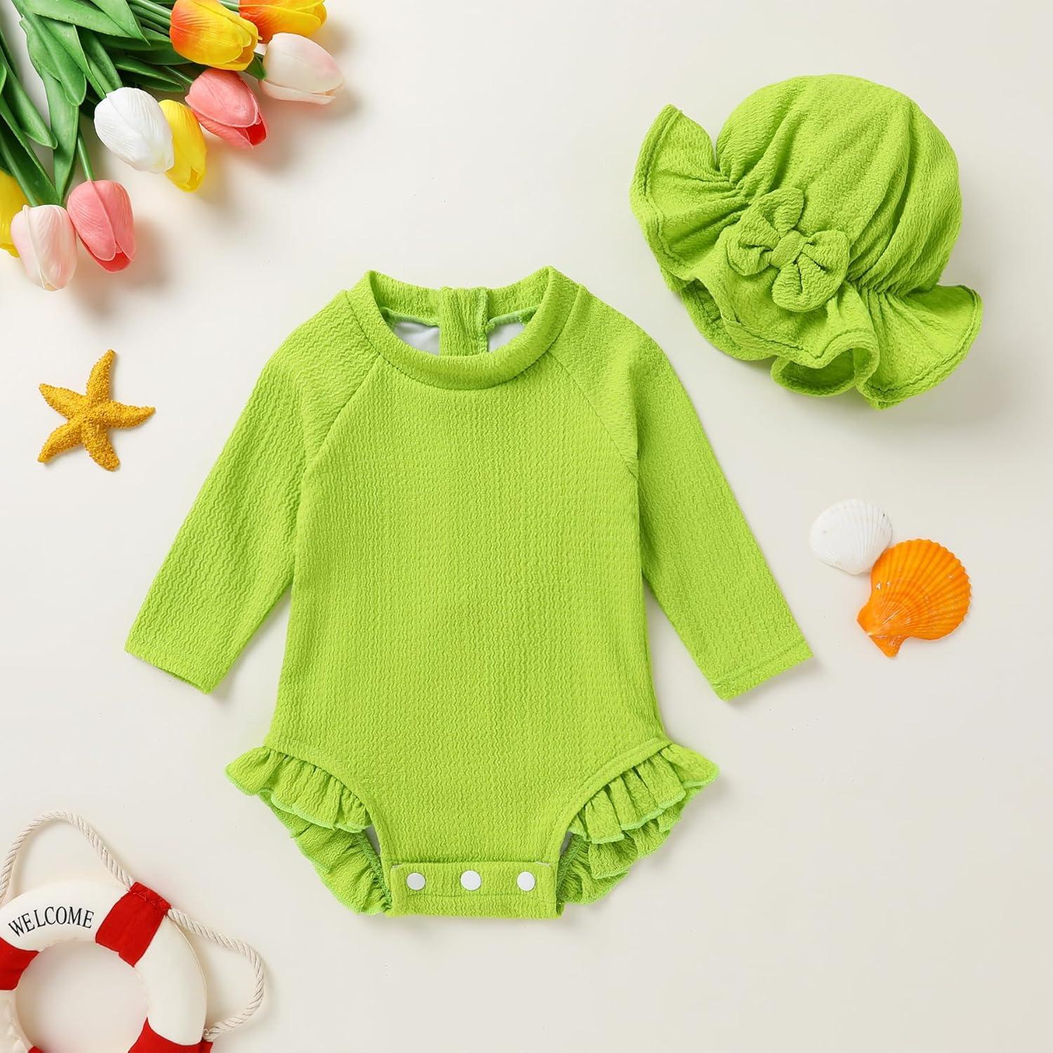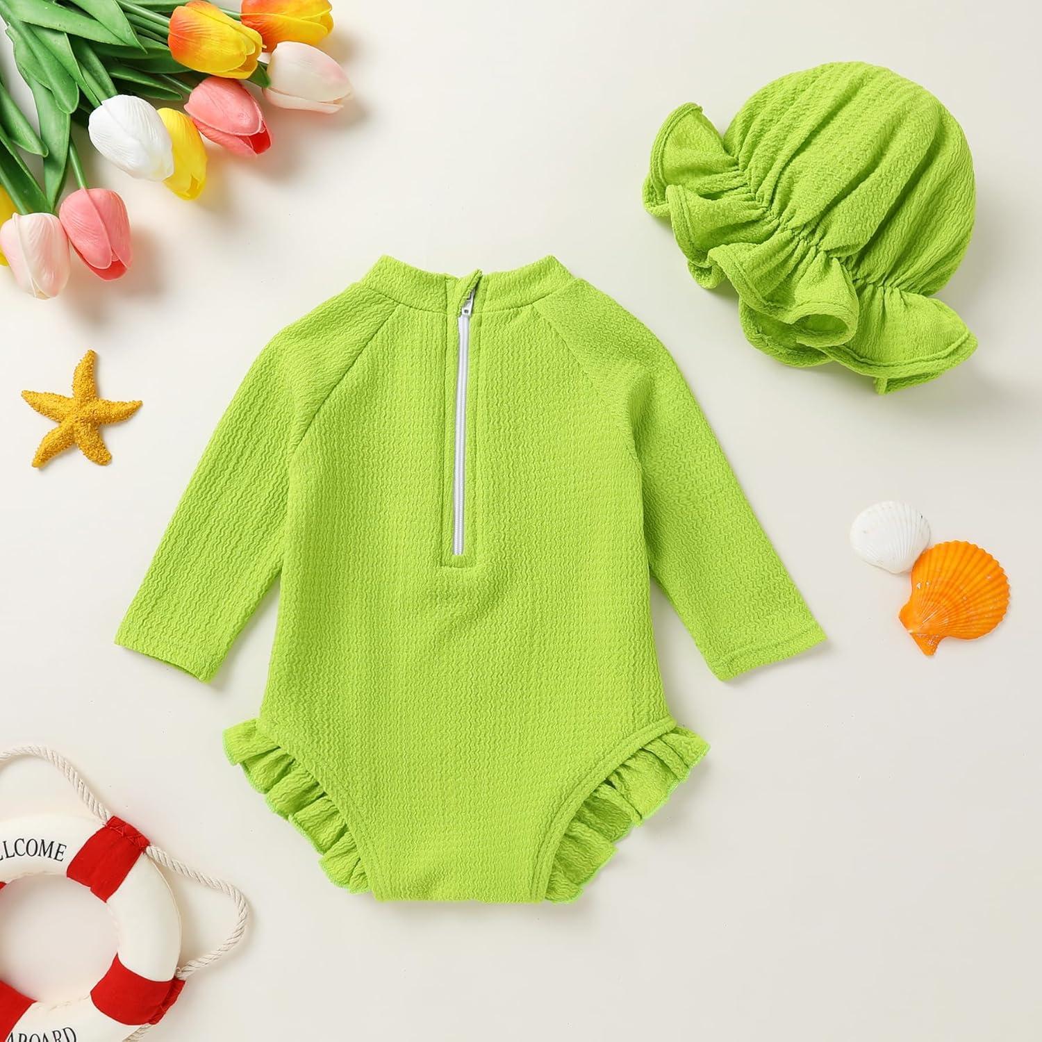 YOUNGER TREE Infant Baby Girls Swimsuit Long Sleeve Swimsuits One Piece Swimsuit Solid Color Bathing Suit with Hat, UPF 50+(Mustard Green)