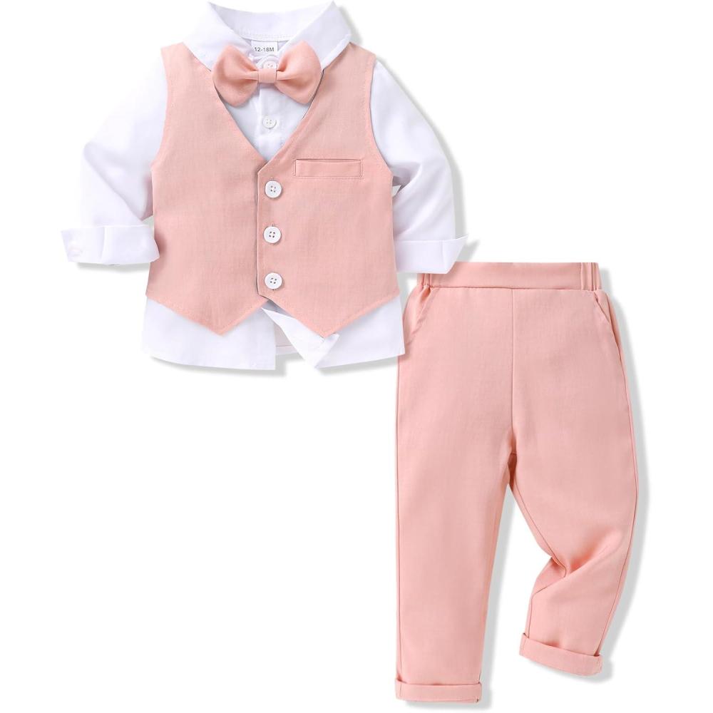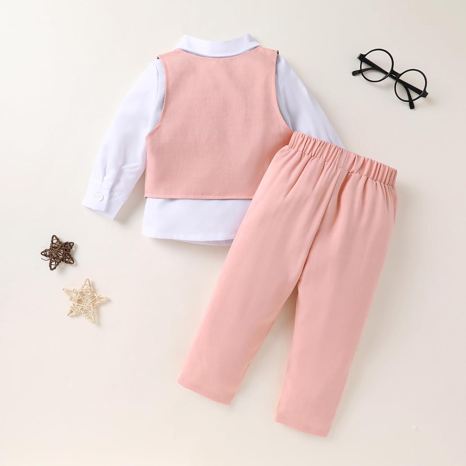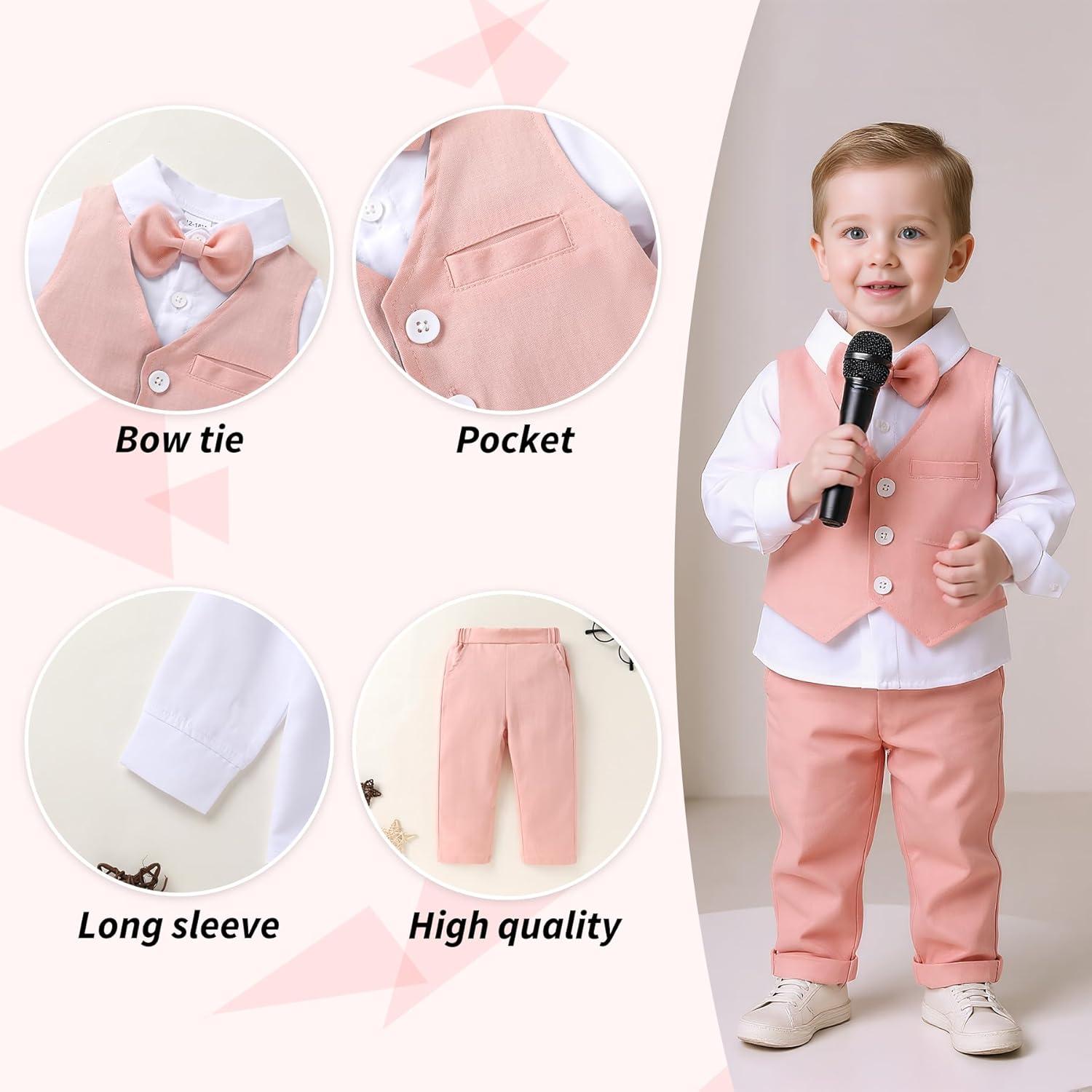 YOUNGER TREE Toddler Boy Clothes Suit Gentleman Wedding Outfits Baby Formal Dress 4-Piece Set(Pink)